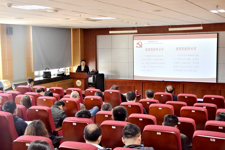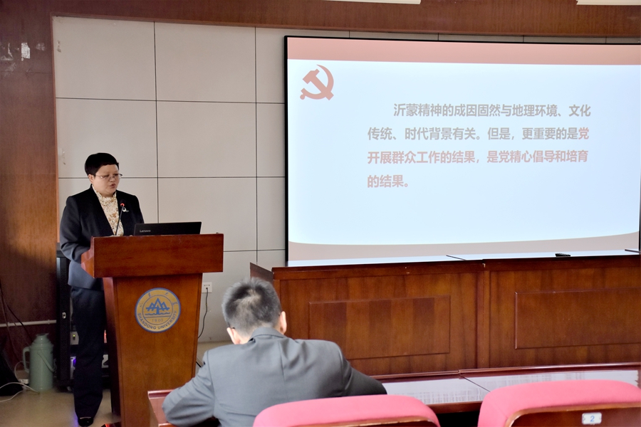 会上,李荣田教授介绍了沂蒙精神的内涵与特征,并从沂蒙精神形成的历史背景、成因以及如何用沂蒙精神推动新时代党建三个角度出发,详细阐述了沂蒙精神的深刻内涵。她表示,沂蒙精神形成于长期的革命和建设之中,体现浓浓的军民鱼水情,沂蒙精神与延安精神、井冈山精神、西柏坡精神都是党和国家的宝贵精神财富,习近平总书记把沂蒙精神的特质高度概括为“水乳交融、生死与共”,这也是对沂蒙精神更科学、更饱满、更立体的论断。沂蒙精神的产生和发扬光大对新时期加强党的建设也具有重要的意义,党的事业需要骨干,沂蒙战士坚定的理想信念,勇往直前、率先垂范的英勇作风,在新时期同样对广大党员有借鉴和启示意义,这也有助于高素质专业化干部队伍的建设,有助于锤炼优良作风和锻造铁的纪律。广大党员要自觉加强党性修养,涵养道德情操,铭记初心使命,弘扬沂蒙精神,走好新时代长征路。