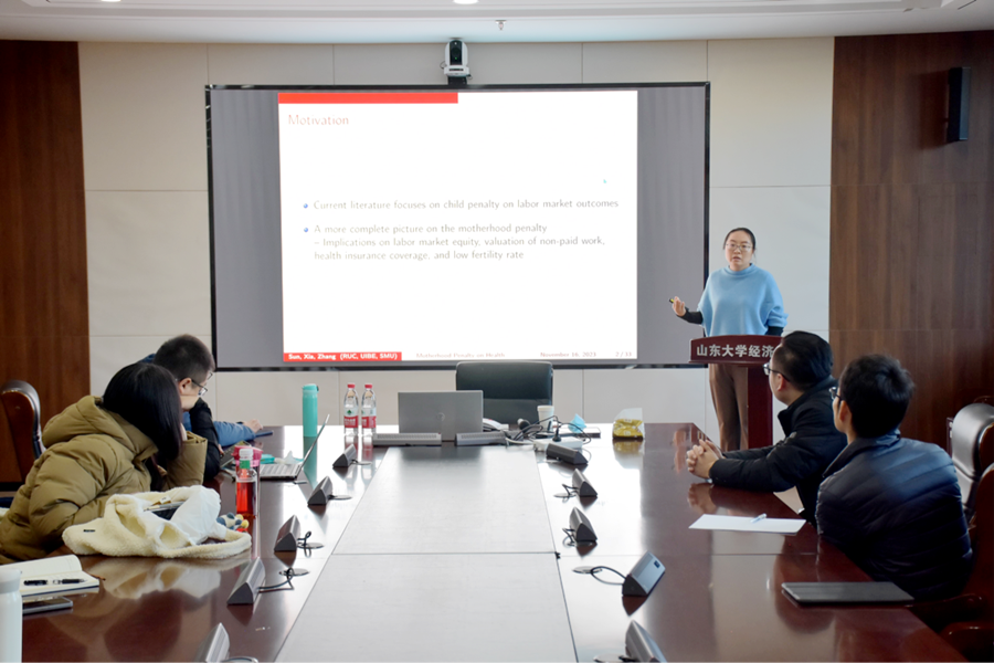 11月16日下午,beats365亚洲版官网第330期高级经济学讲座在中心校区知新楼B321举行,新加坡管理大学助理教授张璇作了主题为“TheMotherhoodPenaltyonHealth:EvidencefromChina”的报告,讲座由学院副研究员宋彦主持,部分师生参会。