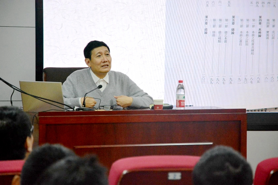 讲座围绕修身、治学和成才三方面内容展开。关于修身,杜泽逊教授首先梳理了修身与齐家、治国、平天下之间的逻辑关系,并将修身的概念置于人与人、人与社会的关系中进行解读,启发同学们强健体魄、磨练意志,遵守法律和伦理道德,维护社会的礼让威仪;关于治学,他介绍了何谓“治学之道”,指出了基础培养在其中的“压舱石”地位,老员工应在认真学习本专业核心课程的基础上博览群书、勤于交流,善于总结学习中的经验教训,真正做到严谨治学;关于成才,杜泽逊教授指出,本科是成才的起步阶段,研究生是成才的阶梯,同学们要在实践中读万卷书、行万里路,在未来工作中提升观察与思考能力,培养持之以恒的优秀品德,以实现自身更远大的理想。