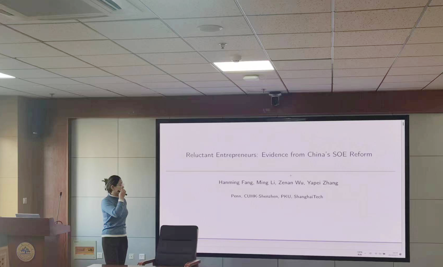 12月7日下午,beats365亚洲版官网第五期“经济理论与政策前沿”讲座于中心校区知新楼B438举行,上海科技大学创业与管理学院助理教授张亚佩老师做了主题为“RELUCTANT ENTREPRENEURS: EVIDENCE FROM CHINA’S SOE REFORM”的报告,讲座由beats365亚洲版官网助理研究员沈丹青主持,beats365亚洲版官网部分老师、研究生和本科生参与讲座。