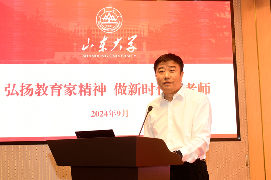 张青对学院系统的荣誉体系建设表示肯定,以“弘扬教育家精神,做新时代好老师”为题,就如何大力弘扬教育家精神、加强师德师风建设进行专题报告。他指出,全国教育大会的胜利召开将新时代高水平教师队伍建设提到了更加重要的位置,从教育家精神的“六个维度”解读了新时代赋予教师的崇高使命和责任,通过剖析典型案例警醒全体教师严格遵守师德规范、坚守师德底线,杜绝任何失范行为。期望全体教师深入学习贯彻全国教育大会精神,充分认识强调师德师风建设的重要意义,大力弘扬教育家精神,躬耕教坛,争做新时代山大好老师。