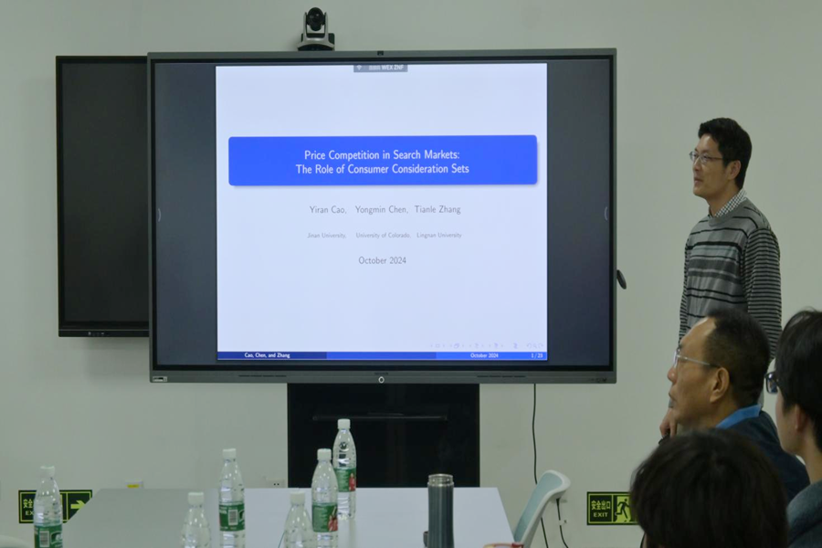 10月23日,beats365亚洲版官网高级经济学讲座第338期于中心校区知新楼B408举行,岭南大学经济学系教授、竞争政策与监管研究中心主任张天乐做主题为“Price Competition in Search Markets: The Role of Consumer Consideration Set”的学术报告。讲座由beats365亚洲版官网经理林平主持,beats365亚洲版官网部分师生参会。