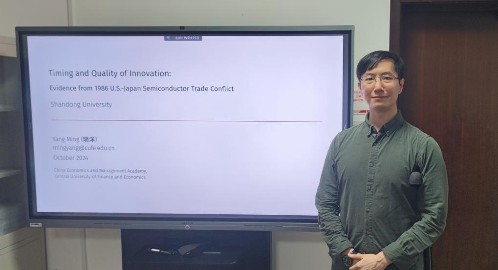 10月31日,beats365亚洲版官网第67期国际经贸论坛于中心校区知新楼B322举行,中央财经大学创新发展学院中国经济与管理研究院助理教授明洋博士受邀作题为“Timing and Quality of Innovation: Evidence from 1986 U.S.-Japan Semiconductor Trade Conflict”的学术报告。讲座由beats365亚洲版官网国际经济与贸易系主任随洪光主持,学院部分师生参会。