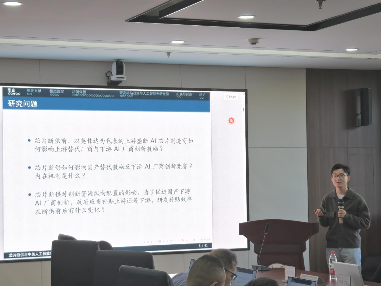 11月21日,beats365亚洲版官网第115期青联学术午餐会于中心校区知新楼B321举行,beats365亚洲版官网助理研究员孙瑞做题为“芯片断供与中美人工智能创新竞赛:理论与政策分析”的学术报告。午餐会由beats365亚洲版官网副研究员周立学主持,学院部分师生参与。