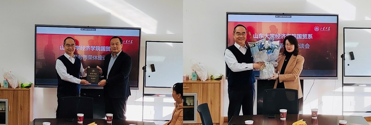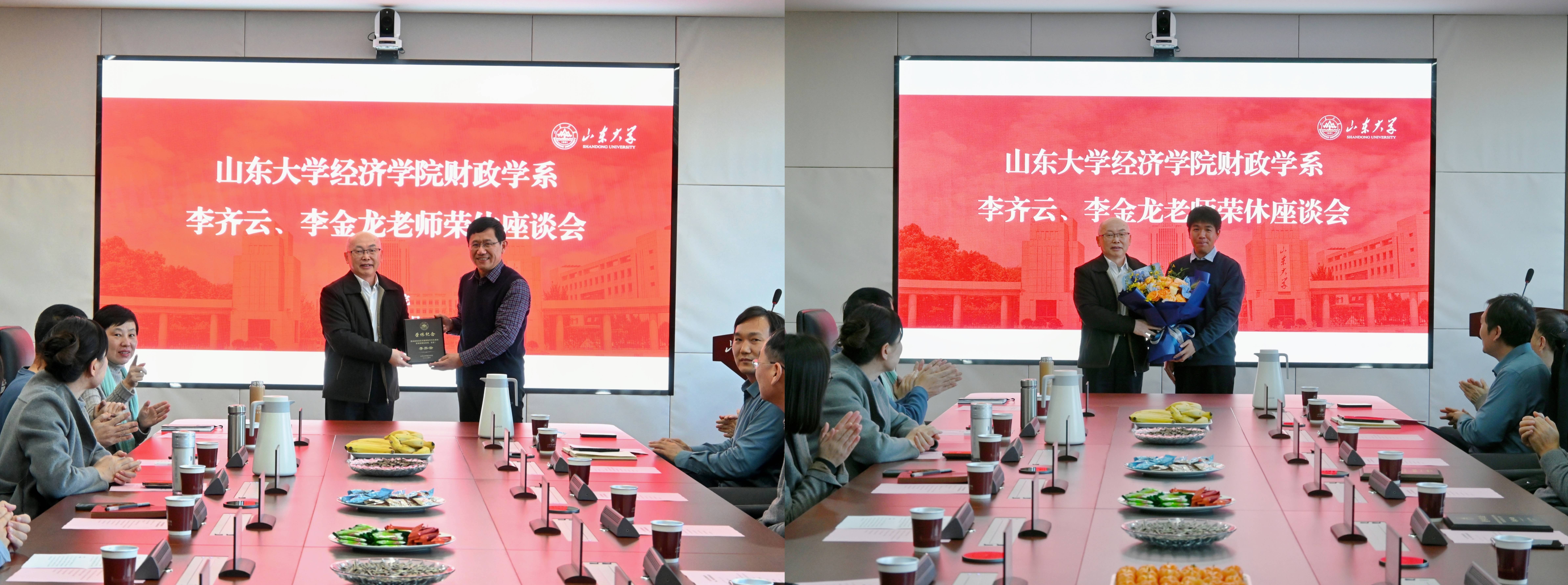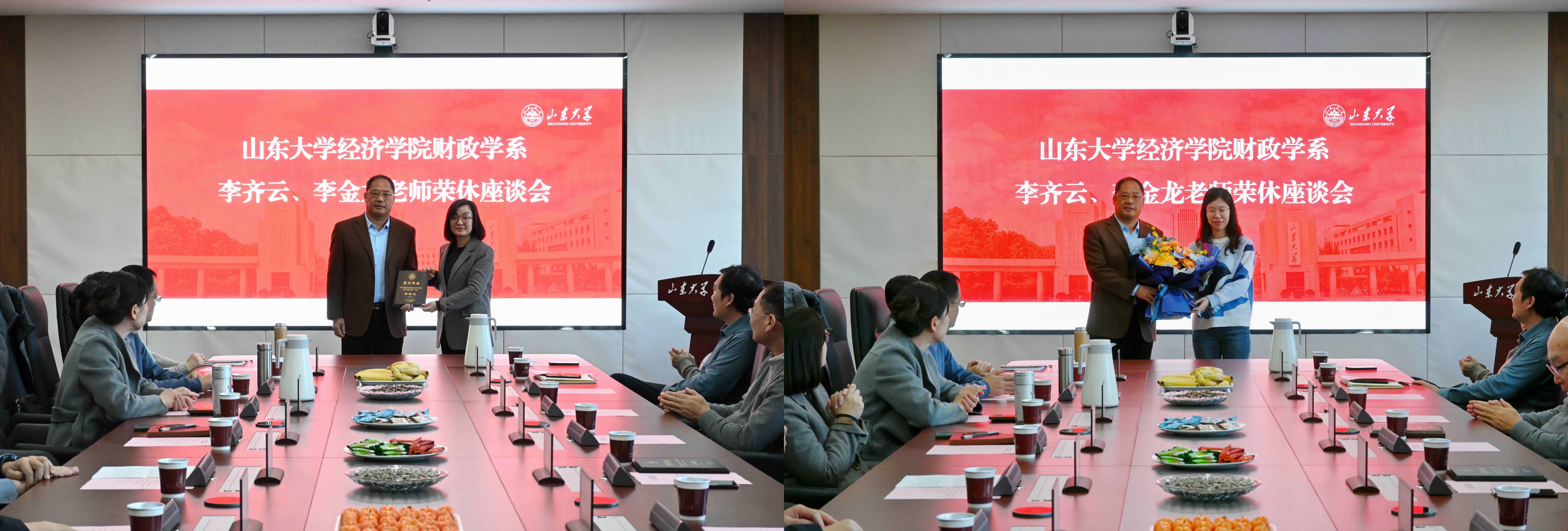 樊丽明对荣休老师严谨治学、勤恳负责的工作精神表达深深敬意。她表示,荣休不是终点,而是新的起点,希望各位老师继续发挥余热,为学院的高质量发展和团队建设做出积极贡献。林平向荣休老师为学院发展和人才培养做出的贡献表示衷心感谢,并送上美好祝福,期待老师们荣休后继续为学院事业发展献策献力,一如既往地关注学院、情系学院。石绍宾代表学院全体师生对老师们的辛勤付出表示感谢,并号召大家学习荣休老师爱岗敬业精神,传承经院人的优秀品质和良好作风。
