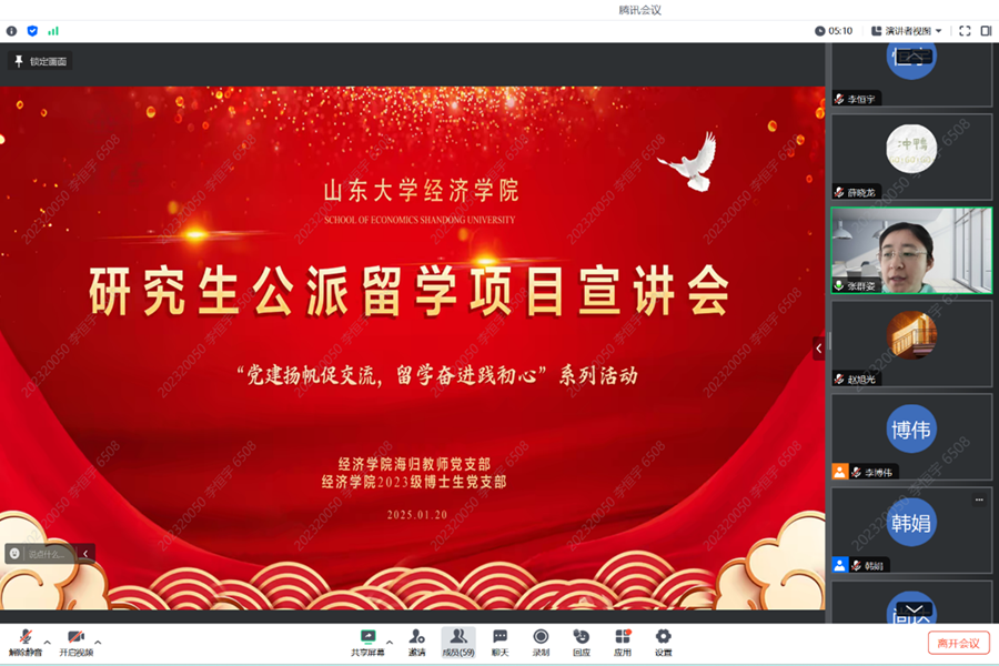 本次活动分为研究生公派留学项目解读、师生留学经验分享、答疑交流三个环节。学院国际合作办公室韩娟老师结合往年案例和数据,对国家建设高水平大学公派研究生项目、创新型人才国际合作培养项目等各类研究生公派留学项目的政策与申请流程进行详细解读。海归教师代表张吉鹏、牛帅、张仁斌通过分享申请公派留学的亲身经历、分析国内外学术资源和研究上的差异化等,鼓励同学们积极走出去,感受科研和文化的多样性,不断探索学术前沿,提升自身国际化科研能力。2023级博士生王远志即将赴瑞士洛桑大学开展联合培养,他分享了自己的申请经验和未来规划;2022级博士生亓锐回顾了自己在加拿大多伦多大学的留学经历;正在英国伦敦大学学院攻读博士学位的2020级金融硕士生宋昀澄通过视频分享了自己的留学心得。活动中,师生代表还就同学们在联系国外导师、公派留学费用、申请材料准备等方面的问题进行了细致解答,同学们纷纷表示对公派出国留学有了更加清晰的认识。
