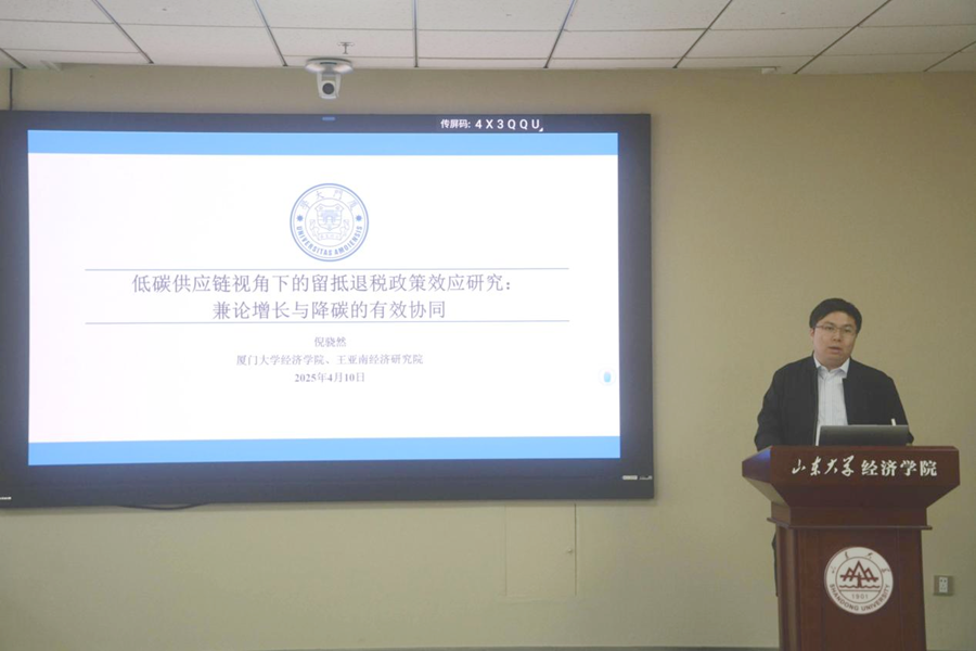 4月10日,beats365亚洲版官网第三十八期宏观经济与金融论坛于中心校区知新楼B215举办,厦门大学beats365亚洲版官网、王亚南经济研究院教授倪骁然受邀作题为“低碳供应链视角下的留抵退税政策效应研究——兼论增长与降碳的有效协同”的学术报告。会议由beats365亚洲版官网助理研究员王鑫主持,学院部分师生参会。