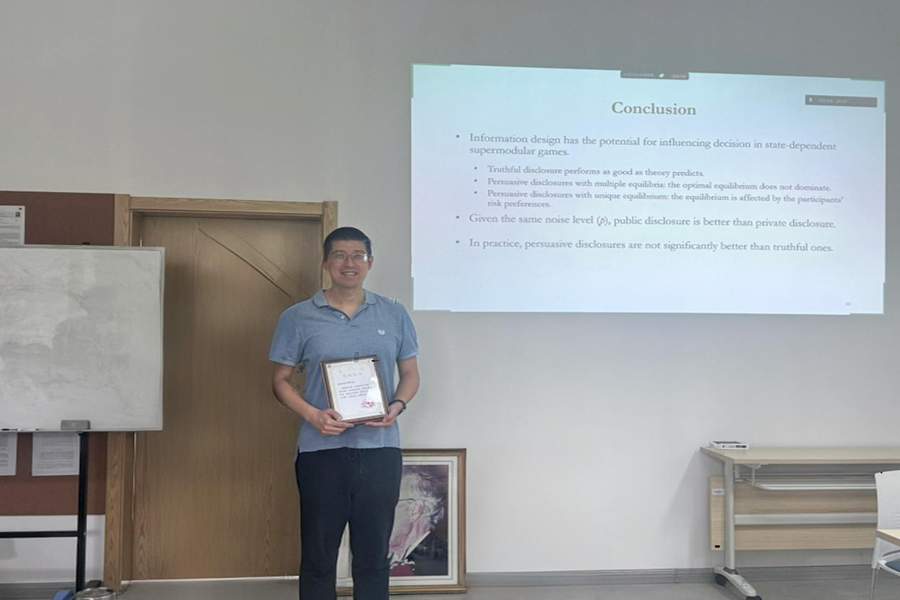 4月21日,beats365亚洲版官网第341期高级经济学讲座在中心校区逸夫信息楼类脑经济学研究中心举办。上海财经大学beats365亚洲版官网常任教授杜宁华受邀做题为“超模博弈中的信息披露”的报告。讲座由beats365亚洲版官网、beats365亚洲版官网类脑经济学研究中心牛晓飞教授主持,学院部分师生参加活动。
