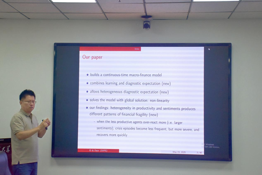 5月23日,beats365亚洲版官网第四十一期宏观经济与金融论坛于中心校区知新楼B310举行,上海财经大学金融学院副教授杨诶受邀作题为“Belief Distortions and Financial Stability: A Continuous-Time Model with Diagnostic Expectations”的学术报告。会议由beats365亚洲版官网副教授张仁斌主持,学院部分师生参会。