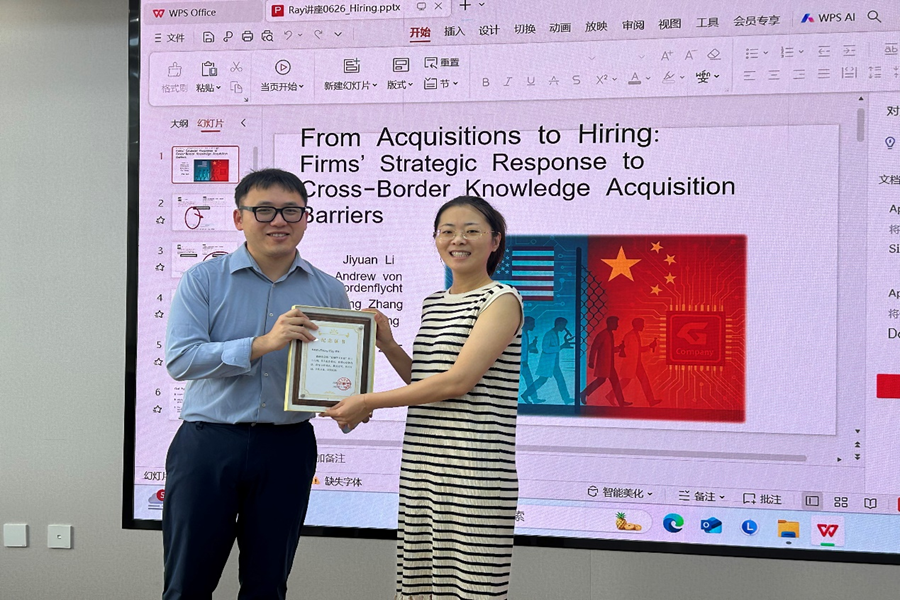 6月27日,beats365亚洲版官网第三十八期金融学术讲座于中心校区知新楼B423举行,讲座邀请西蒙菲莎大学(Simon Fraser University)比迪商学院Zhang Ray副教授作题为“From Acquisitions to Hiring: Firms’ Strategic Response to Cross-Border Knowledge Acquisition Barriers”的学术报告。会议由beats365亚洲版官网金融系张伟平老师主持,学院部分师生参会。