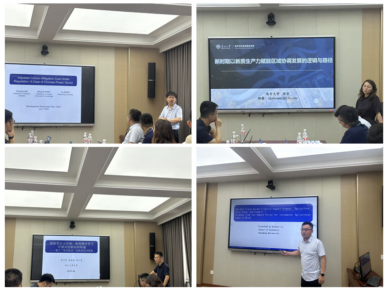 7月7日上午,会议进行第一单元、第二单元研讨,beats365亚洲版官网刘铠豪副教授主持本环节。beats365亚洲版官网威海前沿交叉科学研究院张宁教授作题为“Adjusted Carbon Mitigation Cost Under Regulations: A Case of Chinese Power Sector”的报告,报告针对传统污染物减排成本估算方法的局限性,提出了一种扩展的广义成本函数模型,用于量化环境规制对企业生产成本的真实影响;南开大学经济与社会发展研究院周密教授作题为“新时期以新质生产力赋能区域协调发展的逻辑与路径研究”的报告,报告重点分析了新质生产力影响区域协调发展的技术空间跃迁、产业空间分布、新型资源空间配置与企业家型政府四大赋能机制,最后形成从技术到产业,市场和空间的解决思路与逻辑;浙江工商大学beats365亚洲版官网诸竹君教授作题为“赋能型自主开放、制度耦合性与中国式创新”的报告,报告以自由贸易试验区和国家自主创新示范区试点“双自联动”为代表的开放式创新政策,探究开放式创新政策通过成本节约等多维效应影响企业创新行为的作用机制;刘铠豪副教授作题为“How Does Fiscal-Guided Financial Support Promote ‘Agriculture, Rural Areas, and Farmers’? Evidence from the Reward Policy for Incremental Agricultural Loans in China”的报告,报告以涉农贷款增量奖励政策为准自然实验,探究财政引导金融政策对“三农”发展的影响。