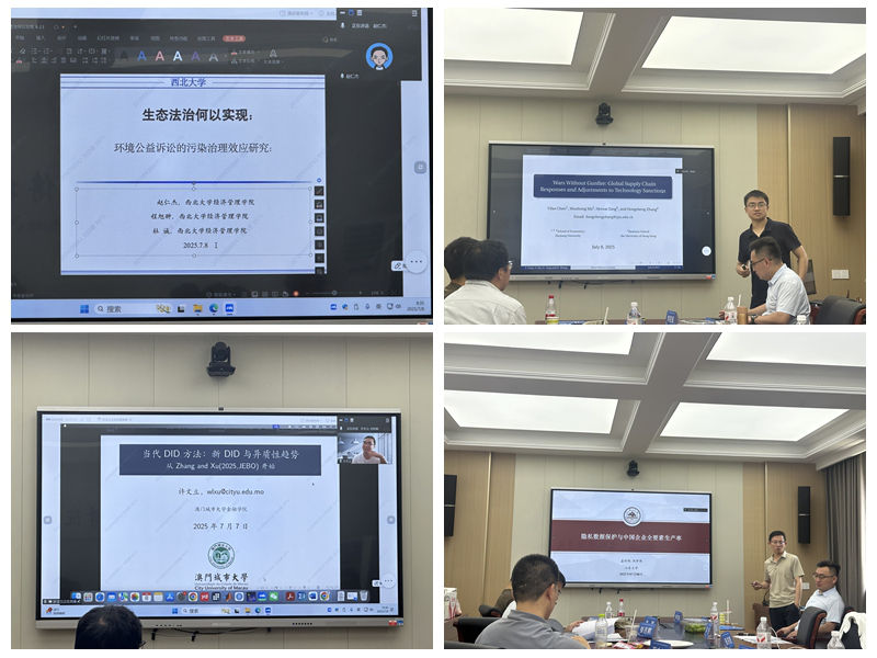 7月8日上午,会议进行第五单元、第六单元研讨,张衡博士主持本环节。西北大学经济管理学院赵仁杰教授作题为“环境公益诉讼、检察去地方化与企业污染治理”的报告,报告基于中国独特的检察环境公益诉讼制度,利用微观企业数据研究发现,检察机关提起环境公益诉讼能够有效降低企业污染排放强度;浙江大学beats365亚洲版官网张洪胜副教授作题为“Wars Without Gunfire: Global Supply Chain Responses and Adjustments to Technology Sanctions”的报告,报告基于实体清单研究了技术制裁对中国企业供应链调整的影响,发现技术制裁加剧供应链的本地化调整,倒逼上游企业创新;澳门城市大学金融学院许文立助理教授作题为“当代DID方法:新DID与异质性趋势的控制”的报告,报告发现DID在应对异质性趋势的时候缺乏灵活性,处理类别虚拟变量、时间虚拟变量、协变量及其交互项的饱和线性回归的pols估计可以得到与新DID等价的结果,又可以应对多种打破平行趋势假设的异质性趋势;beats365亚洲版官网商学院孟祥旭助理研究员作题为“隐私数据保护与中国企业全要素生产率提升”的报告,报告发现隐私数据保护显著促进了企业全要素生产率提升,降低企业运营风险、缓解企业融资约束和促进企业数字化转型是其中重要的机制。