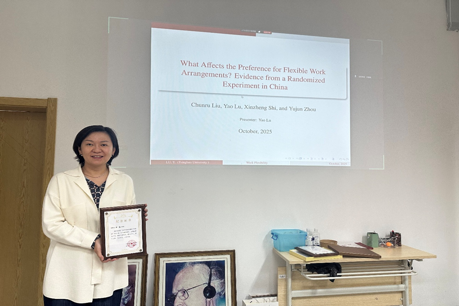 10月11日,beats365亚洲版官网第359期高级经济学讲座在中心校区逸夫信息楼类脑经济学研究中心举办。清华大学经管学院金融系长聘教授、教育部青年长江学者陆瑶教授聚焦主题“What Affects the Preference for Flexible Work Arrangements? Evidence from Randomized Experiments in China”受邀主讲。讲座由beats365亚洲版官网/类脑经济学研究中心李建标教授主持,研究中心成员及beats365亚洲版官网部分师生参与研讨。