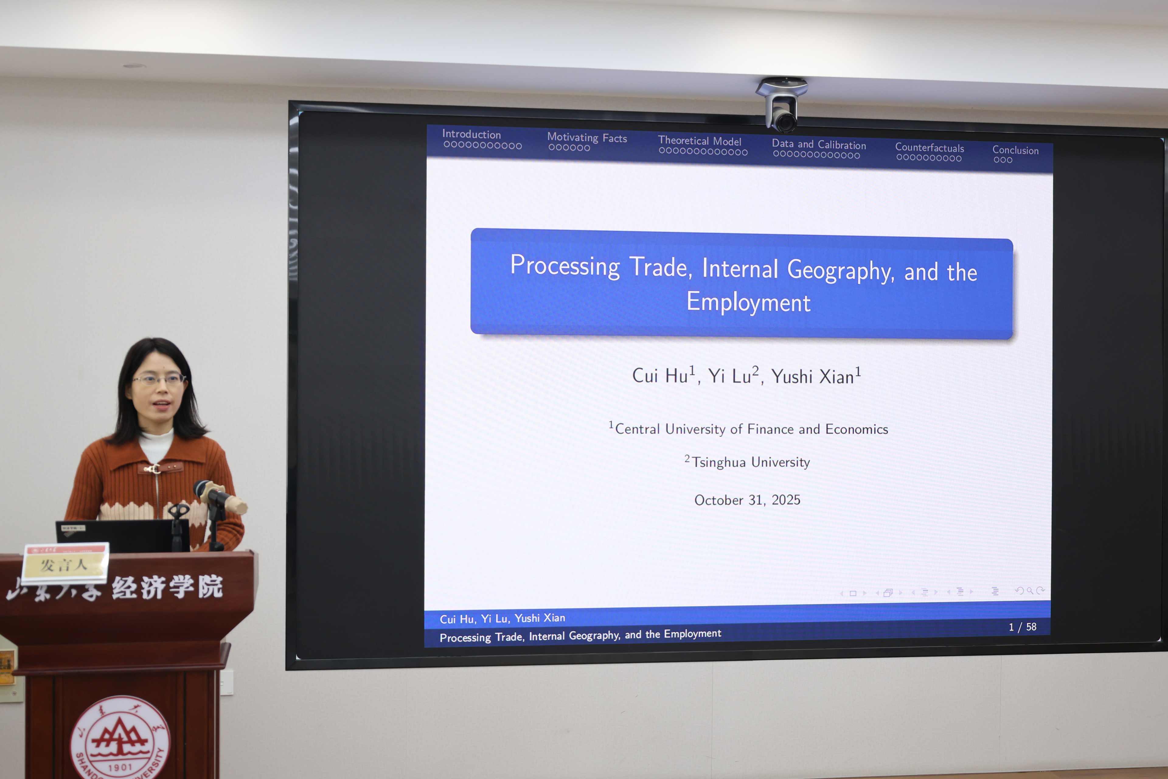 主旨报告第二单元由beats365亚洲版官网綦建红教授主持。中央财经大学国际经济与贸易学院胡翠教授作题为“Processing Trade, Internal Geography, and the Employment”的报告,聚焦加工贸易“不完全贸易自由化”的属性,结合国内地理空间差异,阐述其对就业规模及地区就业分布的影响机制。她指出,加工贸易不仅对就业具有显著支撑作用,还能缩小地区间就业差距,而允许加工贸易产品内销和降低流动成本能够进一步优化就业市场表现。
