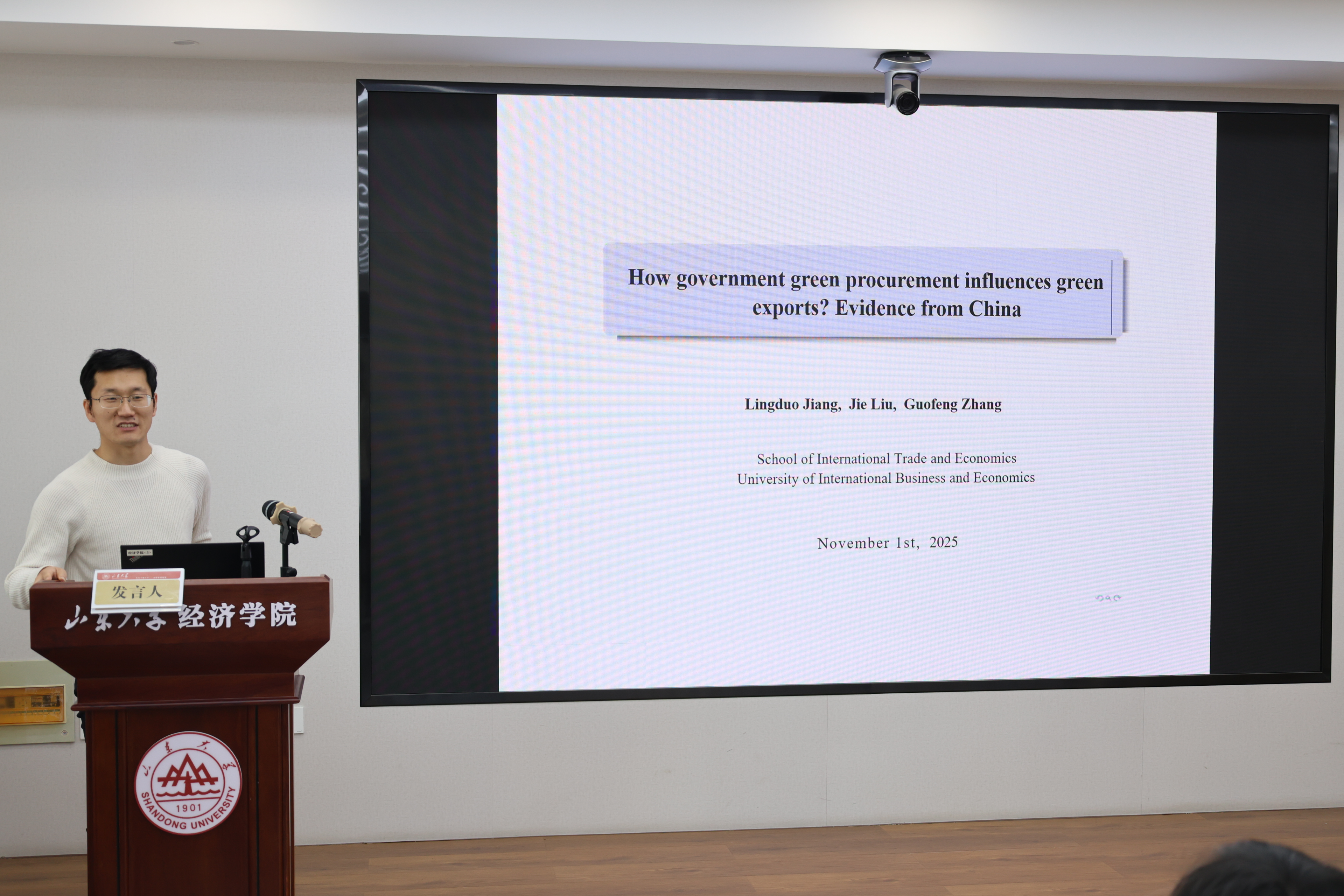 对外经济贸易大学国际经济贸易学院张国峰教授作题为“The effect of government green procurement on green exports: Evidence from China”的报告,从信号传递与资源配置维度揭示政府绿色采购政策的作用机制。他认为,政府绿色采购能够缓解企业融资约束、激发绿色创新活力,推动企业增加绿色产品出口种类、拓展出口市场,进而引导企业绿色转型,助力贸易绿色发展。