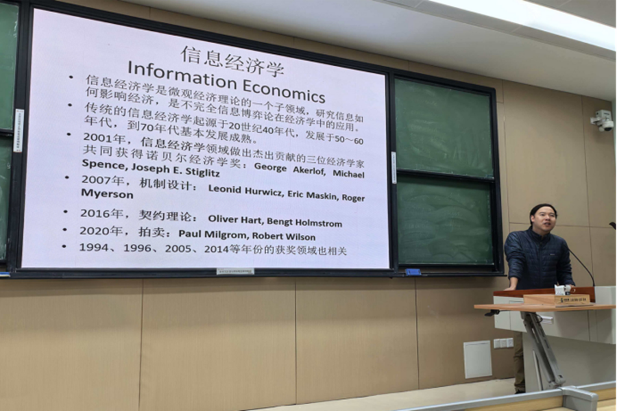 报告围绕信息与利益两大核心要素,系统阐述了信息经济学在理解现代经济决策过程中的关键作用。报告从逆向选择与道德风险等问题出发,深入探讨信息设计等前沿理论进展,重点梳理信息经济学分析框架从传统离散、确定信息结构向连续、随机信息结构的范式演进。报告进一步结合理论模型与实验证据,揭示了不对称信息环境下决策者博弈的策略互动规律与理论构建的精妙动态,呈现出信息经济学领域兼具严谨性与深刻性的前沿学术图景。交流讨论环节,郑捷教授与参会师生就信息经济学前沿理论应用与方法等问题进行充分研讨。