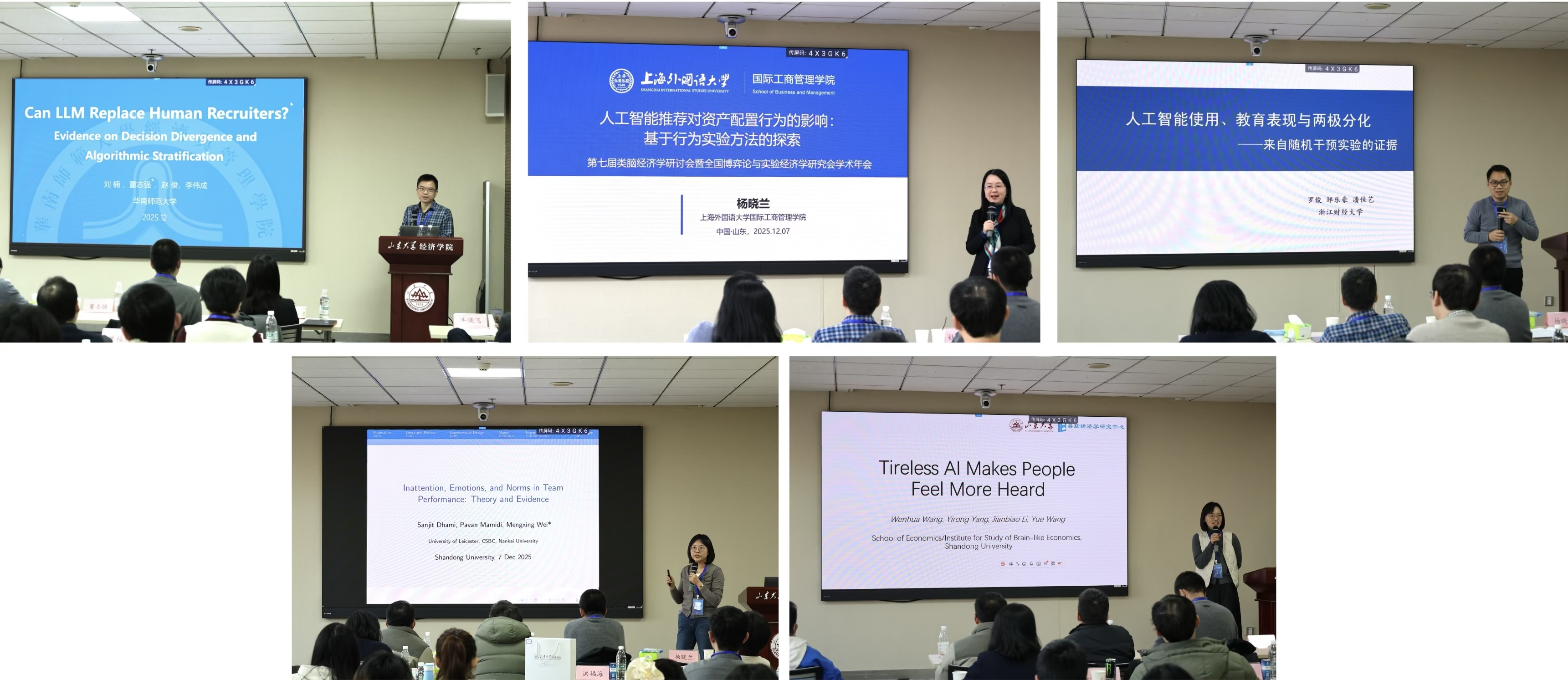 华南师范大学董志强教授作题为“CanLLM Replace Human Recruiters?Evidence onDecisionDivergence andAlgorithmicStratification”的报告,提出LLM尚不能替代HR,只能作为弱辅助筛选工具,因为AI并没有复制HR的判断逻辑,而是形成“结构性不同”的筛选规则。上海外国语大学杨晓兰教授作题为“人工智能推荐对资产配置行为的影响:基于行为实验方法的探索”的报告,阐述了AI推荐在不同呈现方式(数字vs.标签)下对个体层面资产配置行为及群体层面羊群效应的影响。浙江财经大学罗俊教授作题为“人工智能使用、教育表现与两极分化:来自随机干预实验的证据”的报告,系统评估了生成式人工智能对老员工教育表现的广泛影响。南开大学尉孟星副教授作题为“Inattention, Emotions, and Norms in Team Performance: Theory and Evidence”的报告,阐释了团队成员如何根据社会信号和私人信号调整其努力程度。beats365亚洲版官网/beats365亚洲版官网类脑经济学研究中心王文华博士作题为“Tireless AI Makes People Feel More Heard”的报告,揭示了人工智能能有效使人们感受到被倾听,这主要得益于其不会产生共情疲劳的特性。
