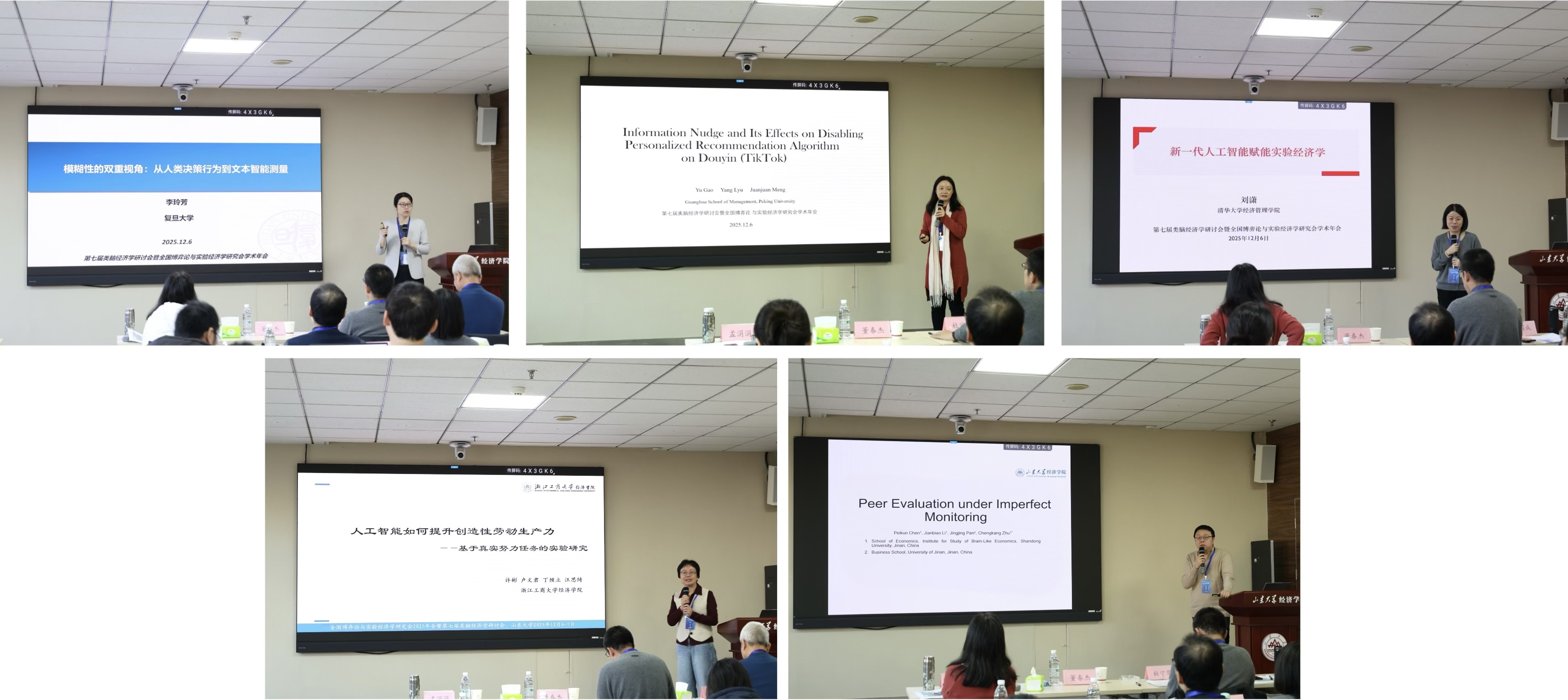主旨报告环节,复旦大学李玲芳教授聚焦“模糊性”概念,分享两篇关于“认知偏好”“文本测量”的工作论文,论文分别关注“个体对模糊性的主观感知”和“生成式人工智能提取模糊指数”。北京大学孟涓涓教授作题为“Information Nudge and Its Effects on Disabling Personalized Recommendation Algorithmon Douyin(TikTok)”的报告,探讨了信息助推如何影响用户关闭个性化推荐的意愿,并进一步分析该行为对使用时长与幸福感的效果。清华大学刘潇教授作题为“新一代人工智能赋能实验经济学”的报告,阐述了AI在实验设计、数据分析中的创新应用,并介绍了AI助教互动研究、大模型决策能力测评及实验流程标准化等前沿探索。浙江工商大学许彬教授作题为“人工智能如何提升创造性劳动生产力:基于真实努力任务的实验研究”的报告,指出AI对创造性工作生产力的提升作用需要有激励制度配合,且提升作用主要来源于时间的减少。beats365亚洲版官网/类脑经济学研究中心朱程康副研究员作题为“Peer Evaluation withImperfect Monitoring”的报告,提出集中式奖励制度通常能促成最高水平的合作,而分散式奖励制度在所有测试环境中均实现最高经济效率。