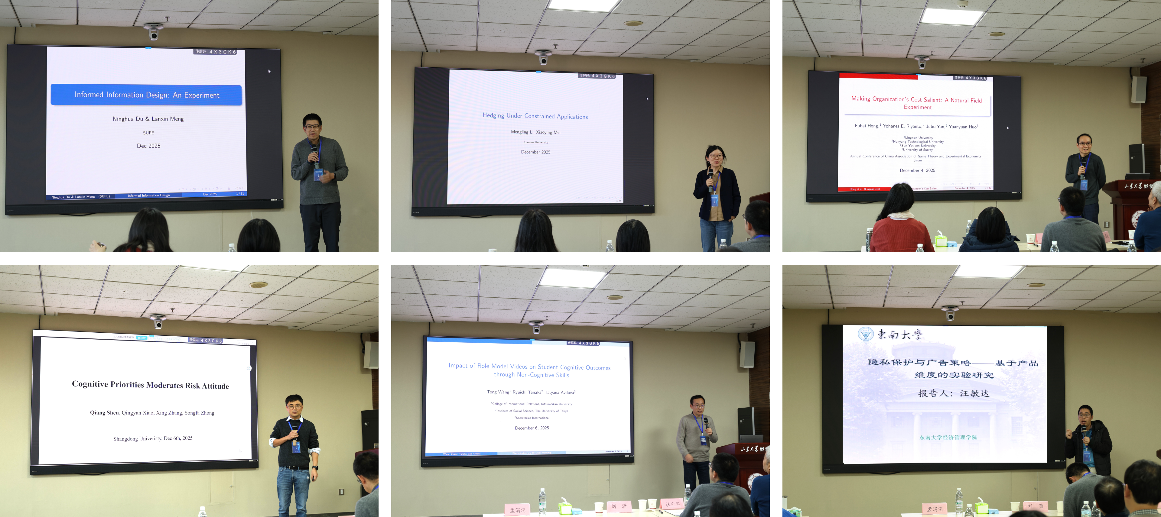 上海财经大学杜宁华教授作题为“Informed Information Design: An Experiment”的报告,对比分析“知情”与“不知情”信息设计对厂商信息披露行为及消费者决策的作用差异。厦门大学李梦玲教授作题为“Hedging under Constrained Applications”的报告,考察不同录取规则、志愿数量限制等因素如何共同作用于员工最优志愿填报策略。香港岭南大学洪福海副教授作题为“Making Organization's Cost Salient: A Natural Field Experiment”的报告,揭示了提高公共资源使用成本的显著性对个体成员订购行为的影响。上海外国语大学沈强教授作题为“Cognitive Priorities Moderate Risk Attitude”的报告,研究自我与他人场景下个体风险偏好的差异并通过鼠标追踪和眼动追踪数据刻画潜在的决策过程。立命馆大学王通教授作题为“Impact of Role Model Videos on Student Cognitive Outcomes and Non-Cognitive Skills”的报告,阐述榜样视频对员工认知影响的相关研究。东南大学汪敏达教授作题为“Privacy Protection and Firm's Advertising Strategy Considering Multiple Attributes of Product: An Experimental Study”的报告,探讨不同的消费者隐私保护水平下,厂商如何制定广告内容的问题。