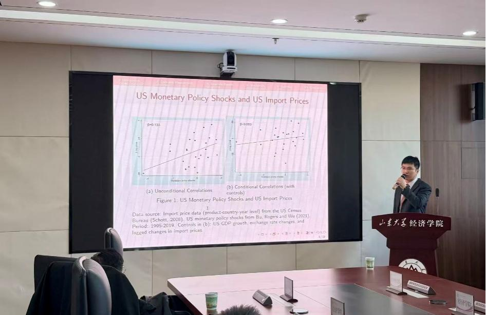报告聚焦全球经济一体化背景下美国货币政策的跨境传导机制,以传统开放经济宏观模型预测与现实经济现象的差异为切入点,通过细分贸易数据的实证分析,揭示了美国货币政策调整的双重效应。研究发现,美国未预期到的货币政策收紧不仅会推高其自身进口价格,形成与经典理论预测不符的“回流效应”,同时会产生显著的“溢出效应”,导致其他国家的进口价格同步上涨。为厘清传导机制内在逻辑,报告以中国出口企业为研究样本,首次识别出“融资成本渠道”的关键作用——美国货币政策收紧后,中国出口企业的流动性状况通常会出现恶化,而面临更高融资成本或更严格流动性约束的企业,其产出价格对政策冲击的反应更为突出。报告过程中,卢凌飞就细分数据处理、实证模型设定、机制识别策略等学术问题,与参会师生进行深入交流研讨。