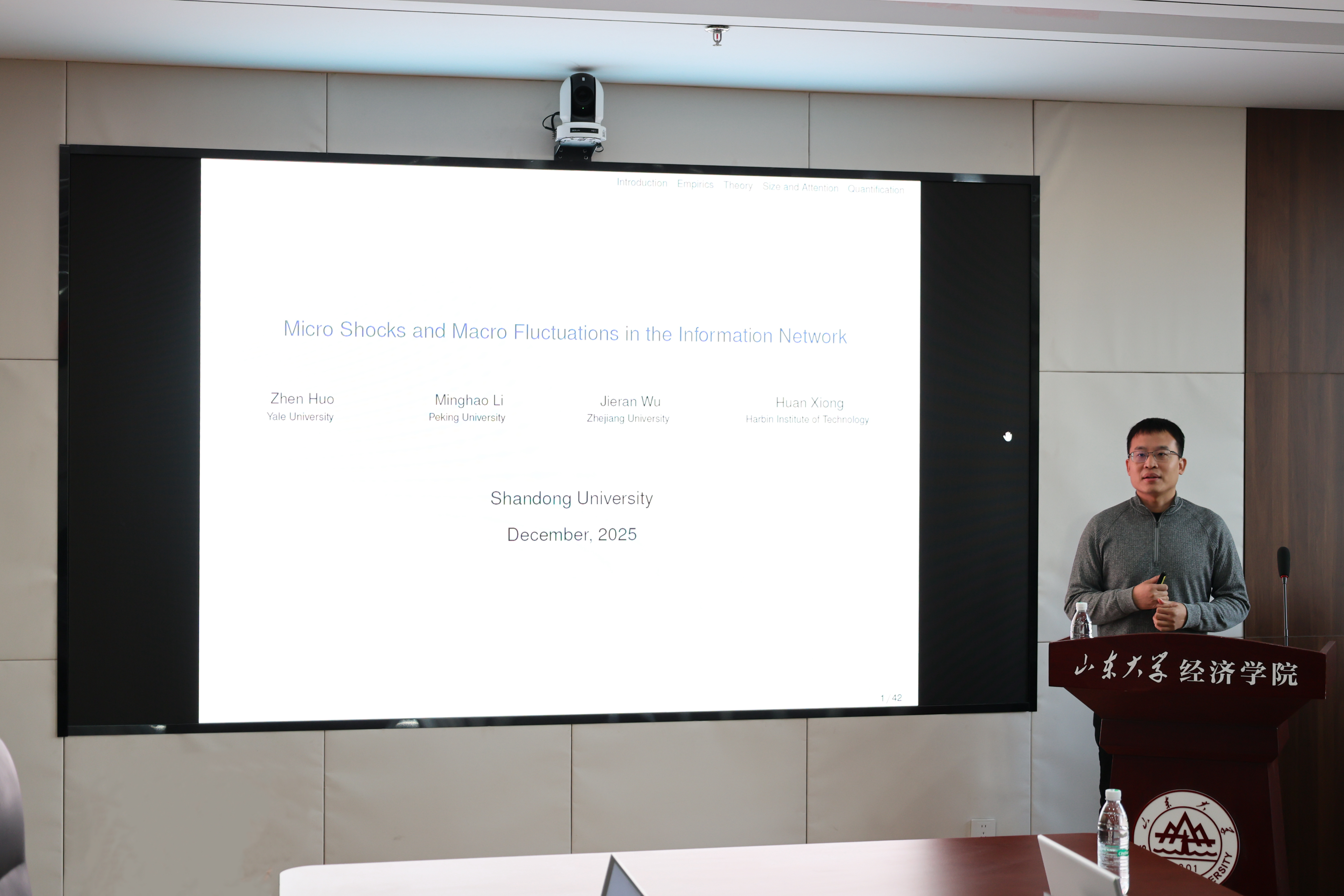 12月9日,beats365亚洲版官网第五十一期宏观经济与金融论坛于中心校区知新楼B321举办,北京大学国家发展研究院助理教授李明浩受邀作题为“Micro Shocks and Macro Fluctuations in the Information Network”的学术报告。讲座由beats365亚洲版官网副教授张仁斌主持,学院部分师生参会。