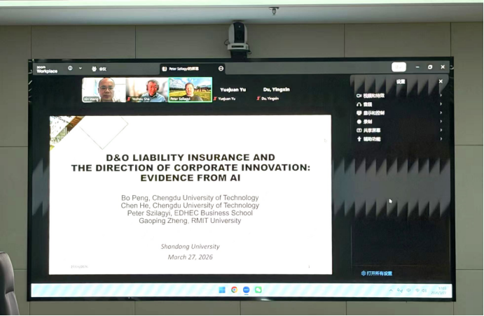 报告基于行为代理理论,探讨董事及高管责任保险(D&O)如何影响企业创新方向。研究指出,作为高风险、高投入的通用技术,企业在推进相关创新时常面临管理者个人声誉、诉讼与职业风险的约束,而D&O责任保险能够在一定程度上缓解这一顾虑。研究发现,D&O责任保险并未显著提升企业整体专利产出,但明显推动企业将创新资源向人工智能领域配置,具体表现为AI专利数量及其占比的提升,这一效应在不确定性较高、民营企业以及缺乏政治关联的企业中更为显著。研究进一步表明,D&O责任保险的作用更偏向于促进企业创新方向的调整,并改善企业的经营表现与市场关注度。报告过程中,Szilagyi教授与参会师生进行了充分研讨。