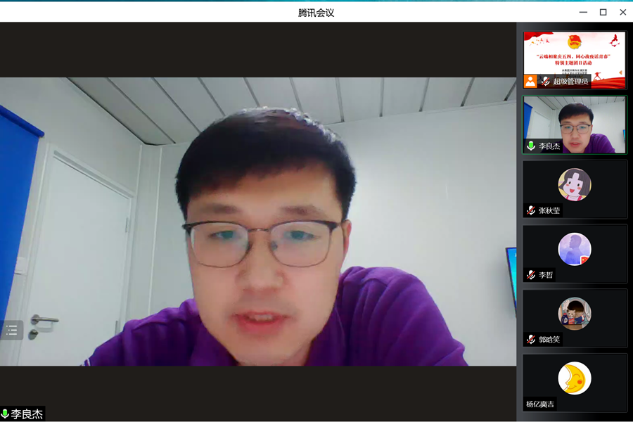2019级金融数学基地班团支部书记周冠辰、2020级员工服务社副主席曹娜、2020级博士班班长孙超三位员工代表分享了隔离感受,向长清区全体工作人员的辛苦付出表示衷心的感谢,同时表示亲历这次战役永生难忘,将以奋战一线的青年同志为榜样传承五四精神,以梦为马,不负韶华。最后,活动在全体奏唱团歌中结束。