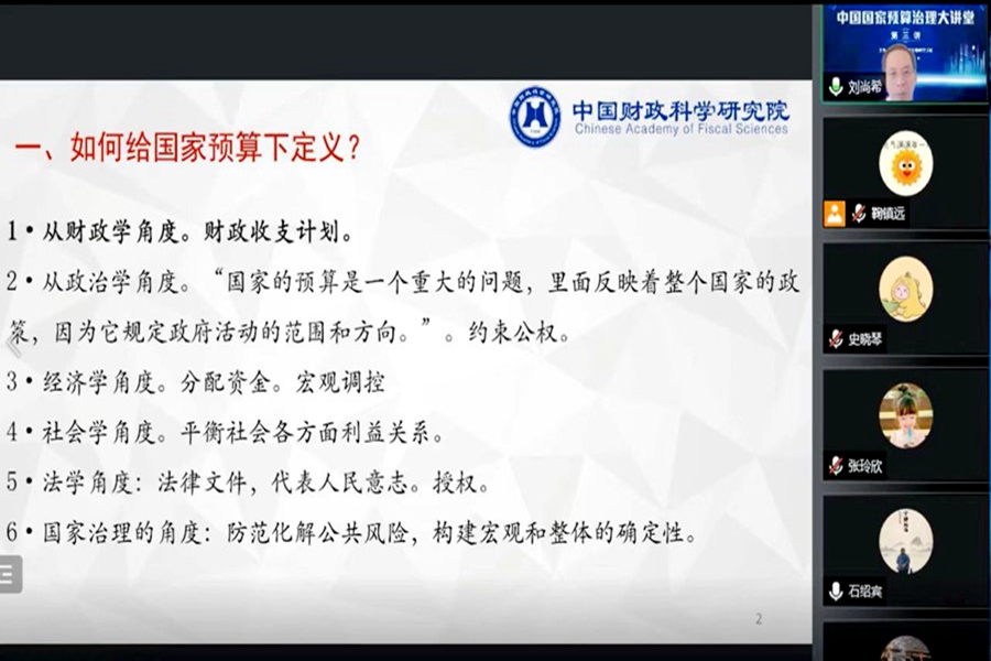 “中国国家预算治理大讲堂”由中国国家预算治理研究联盟主办,是面向国家预算治理研究领域学术界、实务界的持续性学术交流品牌活动,也是作为学术共同体的联盟推动国家预算治理领域的学者交流、学术研究、资源共享、资政育人、服务国家预算治理现代化的一个重要举措。本期大讲堂以线上方式举行,来自全国高校、科研院所、预算管理实务的300余位专家学者和学子参加了本期大讲堂。
