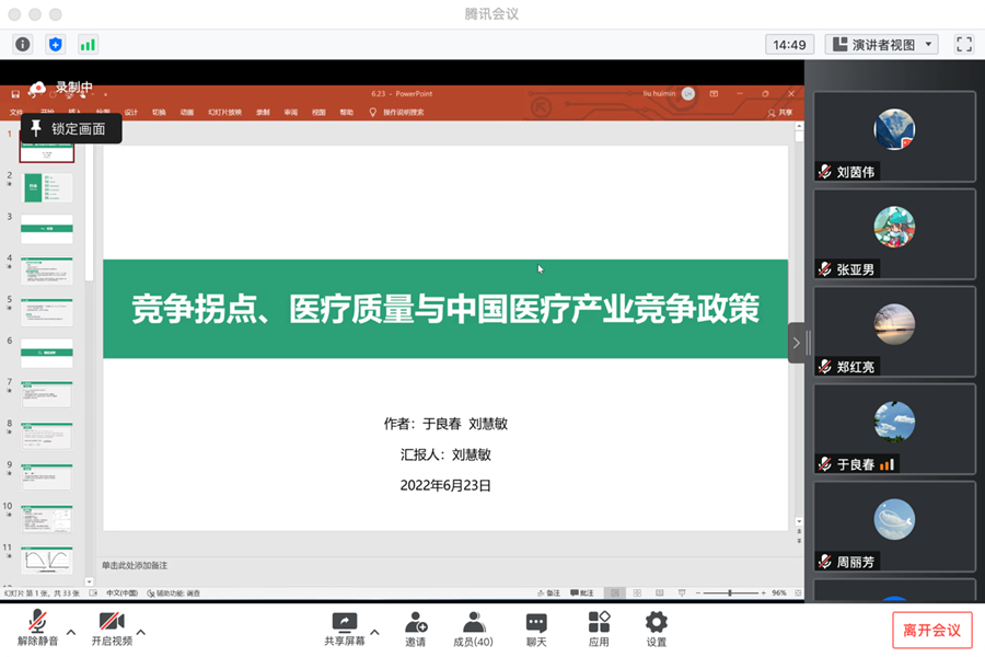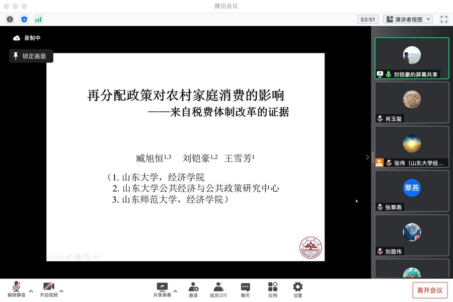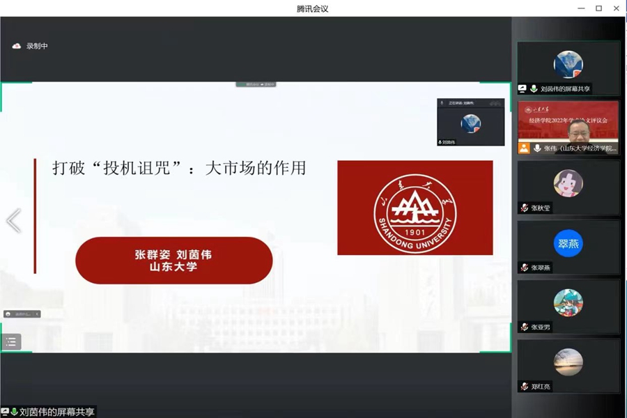 会议先后有五位学者开展汇报。首先,张翠燕作了题为《宏观审慎沟通的区域非对称性研究—基于金融周期视角的考察》的报告。相较货币政策沟通,宏观审慎沟通的研究十分不足,为弥补这一不足,本文采用监督学习的方法构建了宏观审慎沟通指标,并检验了宏观审慎沟通的中观效果,研究发现,宏观审慎沟通效果具有非对称性效应,而且宏观审慎沟通主要通过对区域间金融周期波动溢出联动进行逆周期调节达到熨平整体金融风险的效果。张亚男报告了论文《检疫隔离中的经济行为:社会偏好的挤出及其助推回归的自然实验研究》。鉴于目前尚缺乏检疫隔离对个体经济行为的影响研究,本文借助于外生事件,率先使用实验经济学方法探究并发现了检疫隔离对社会偏好的挤出效应,加深了对检疫隔离影响的理解,并警示评估隔离政策的文献应将这一影响纳入考虑。刘茵伟作了题为《打破“投机诅咒”:大市场的作用》的汇报,为探究建设全国统一大市场能否打破“投机诅咒”从而提高企业创新效率,本文采用2009-2019年沪深A股上市公司的相关数据,构建双重固定效应模型,验证了不同市场环境下投机行为对企业创新效率的不同影响。刘慧敏作了《竞争拐点、医疗质量与中国医疗产业竞争政策》的论文报告。为解决当前医疗需求和医疗资源的矛盾,论文以中国医疗产业竞争为切入点,研究医院竞争对医疗质量的影响,研究指出,随着医院竞争程度的提高,医疗质量呈现U型,目前中国医院竞争程度对医疗质量的影响临近拐点。论文给出建议,各地区应根据医院竞争程度施行相应竞争政策、区别化引导,同时深化医疗体制改革,真正落实分级诊疗制度。最后,刘铠豪作了《再分配政策对农村家庭消费的影响——来自税费体制改革的证据》的论文分享。基于农村税费体制改革这一准自然实验,从家庭消费的微观角度探究了再分配政策对家庭消费的影响作用。研究发现,农村税费体制改革过程中的“费改”和“税改”均促进了家庭消费支出的增长和家庭人均消费支出的增长,并促进了家庭消费结构升级。