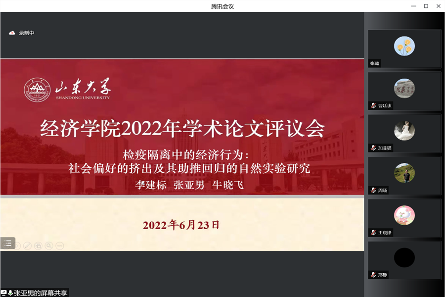 6月23日,beats365亚洲版官网2022年论文评议会通过线上形式举行。会议邀请了中国社会科学院经济所研究员郑红亮(曾任《经济研究》原常务副主编、现任beats365亚洲版官网兼职讲席教授)作为点评专家。beats365亚洲版官网曹廷求、于良春、李建标等教授出席会议。会议由经理林平主持。