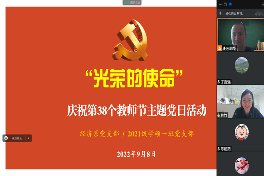 坚持初心使命,强化师德教育。经济系教工党支部和2021级学硕第一党支部师生联合重温习近平总书记关于“四有”好老师的论述,员工向心目中的好老师送上感谢和祝福,从教40年老教师代表分享从教心得和育人初心。学院开展“优秀教师”“先进教育工作者”“先进集体”评选活动,对在教书育人、科学研究、管理服务各工作岗位上踏实进取、爱岗敬业、砥砺奋进的优秀典型和模范代表进行表彰,特别是对在疫情防控特殊时期勇于担当、辛勤付出、做出重要贡献的留校教师志愿者队伍进行表彰。号召全院教职工以先进典型为榜样,涵养爱国奋斗、潜心育人的高尚师德和服从大局、甘于奉献的敬业精神。