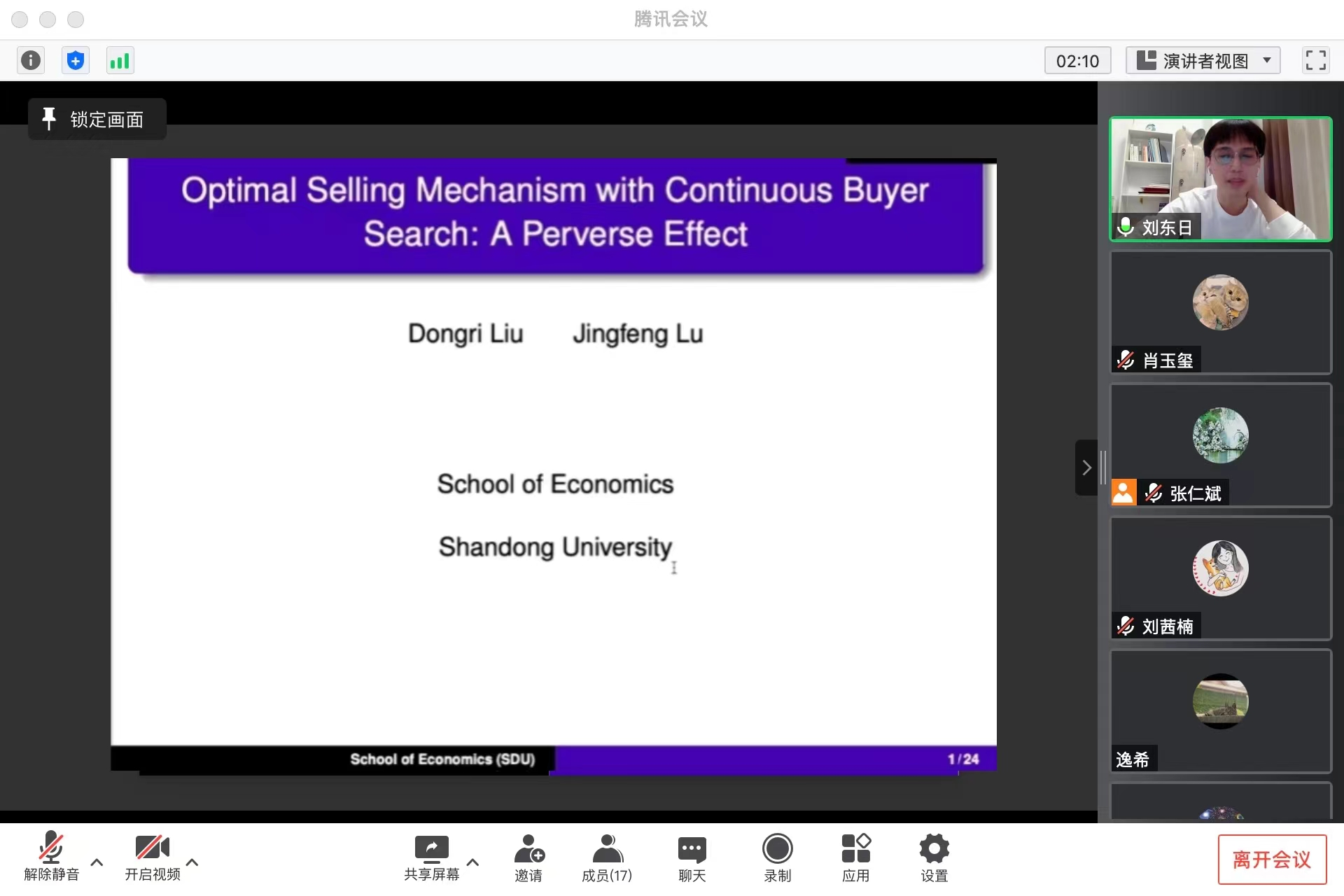 9月15日,beats365亚洲版官网第71期青联学术午餐会以线上形式举行,新加坡国立大学经济学博士刘东日作了题为“Optimal Selling Mechanism with Continuous Buyer Search: A Perverse Effect“的学术报告。本次会议由beats365亚洲版官网助理研究员张仁斌主持,学院部分师生参会。