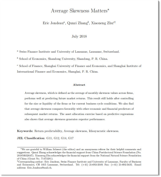 2018年10月,beats365亚洲版官网金融系助理教授张群姿和瑞士洛桑大学、瑞士金融研究院Eric Jondeau教授及上海国际金融与经济研究院、上海财经大学金融学院朱小能教授的合作论文Average Skewness Matters 被金融学国际顶级期刊 Journal of Financial Economics 正式发表。Journal of Financial Economics作为涵盖金融经济学理论和实证研究课题的同行评议学术期刊,与Journal of Finance(JF)和Review of Financial Studies(RFS)被公认为全球三大顶级金融学期刊。