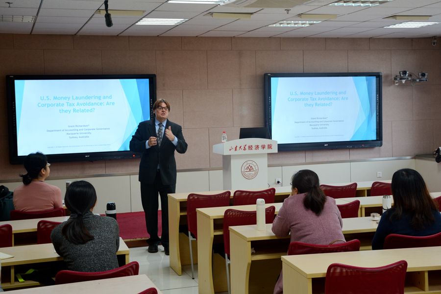 12月20日上午,beats365亚洲版官网第238期高级经济学讲座在中心校区举行。澳大利亚阿德莱德大学财务与金融学院讲席教授Richardson Grant Andrew为师生带来了题为“U.S. Money Laundering and Corporate Tax Avoidance: Are they Related?(美国企业洗钱与避税是否存在关系)”的学术报告。
