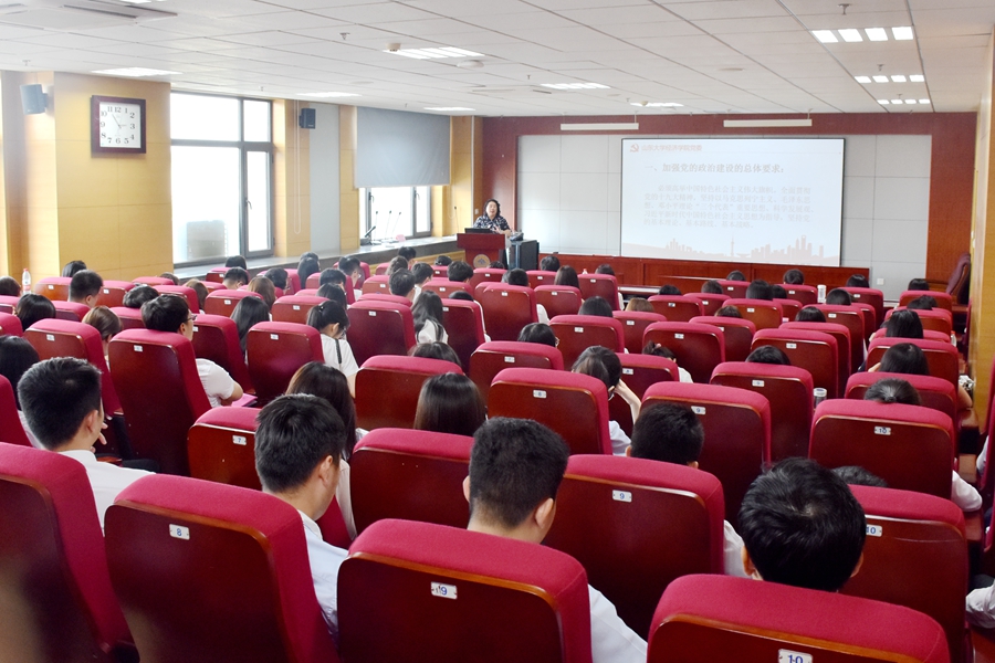 王秀丽以“坚定政治追求,努力做一名合格的共产党员”为题为毕业生上了最后一次党课。她带领毕业生党员一起学习了《中共中央关于加强党的政治建设的意见》,并结合自己的学习体会对即将离校的毕业生党员提出希望:一是坚定政治信仰政治追求,牢记入党誓词。二是加强党性修养,加强理论武装,不忘初心、牢记使命,在实现中华民族伟大复兴的新征程上贡献力量。三是牢记山大“为国育贤”的办学宗旨,将个人梦想融入到新时代国家事业发展中,在各自的岗位上努力工作,用优异的成绩为国家争光、为母校添彩。四是今后的工作生活中严格遵循党章,坚定政治追求,增强“四个意识”、坚定“四个自信”、做到“两个维护”,做一名合格党员。