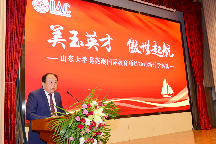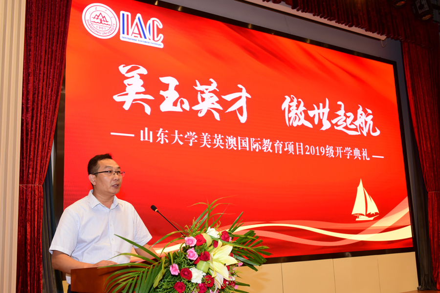 典礼上,刘灿伟代表学校向2019级美英澳员工表示欢迎,并希望广老员工树立远大理想,坚持终身学习理念,早日实现求学梦想。曹廷求代表学院致辞,希望广老员工珍惜美好时光,发愤图强,报效祖国。冯一江向同学们介绍了昆士兰大学,并对同学们未来的学习规划提出了建议。教师代表李晓重点介绍了雅思学习的特点,鼓励大家克服时间紧任务重的困难,早日实现理想。往届生代表臧硕通过讲述自己在山大和海外高校求学的经历和感悟,表达了对山大培养的感激之情。新生代表赵晨羽表示既对在百年老校的学习生活充满期待,也做好了克服一切困难,努力拼搏,早日实现学成报国梦想的准备。典礼最后,石绍宾作总结发言,希他望同学们在国际化教育的浪潮中,能积极学习,博闻通达,创造属于自己最精彩的篇章。