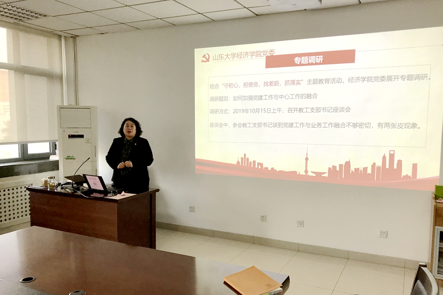 王秀丽介绍了学院开展“不忘初心、牢记使命”主题教育的进展情况,并就前期几次师生座谈会调研情况和问卷调研结果,以及党建工作查找到的问题向全体教职工党员进行了反馈报告。她表示,“两张皮”难题,近年来越来越受到各级党组织和党员的关注、关心,也是党建工作与中心工作结合过程中面临的难点和关键点。分析公司党建工作与中心工作融合不够的原因,主要是因为党建工作抓手少、周期长、见效慢,支部书记、委员往往是兼任,精力难以保证,加之党建工作成效难以考评量化,久而久之,逐渐出现与中心工作融合不高的情况。如果单纯就党务工作抓党建,容易导致党建工作脱实向虚、简单重复,难以发挥党支部的战斗堡垒作用和党员的先锋模范作用。