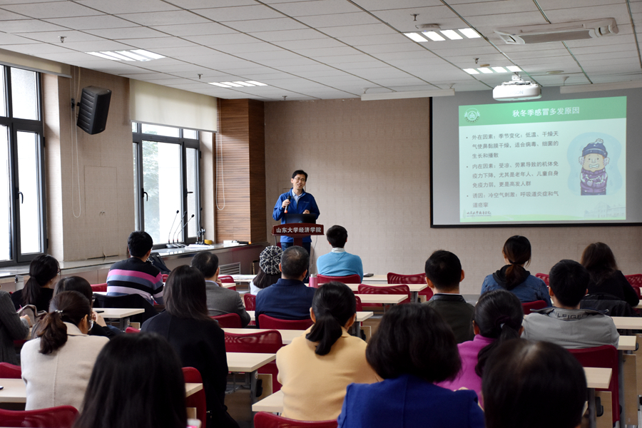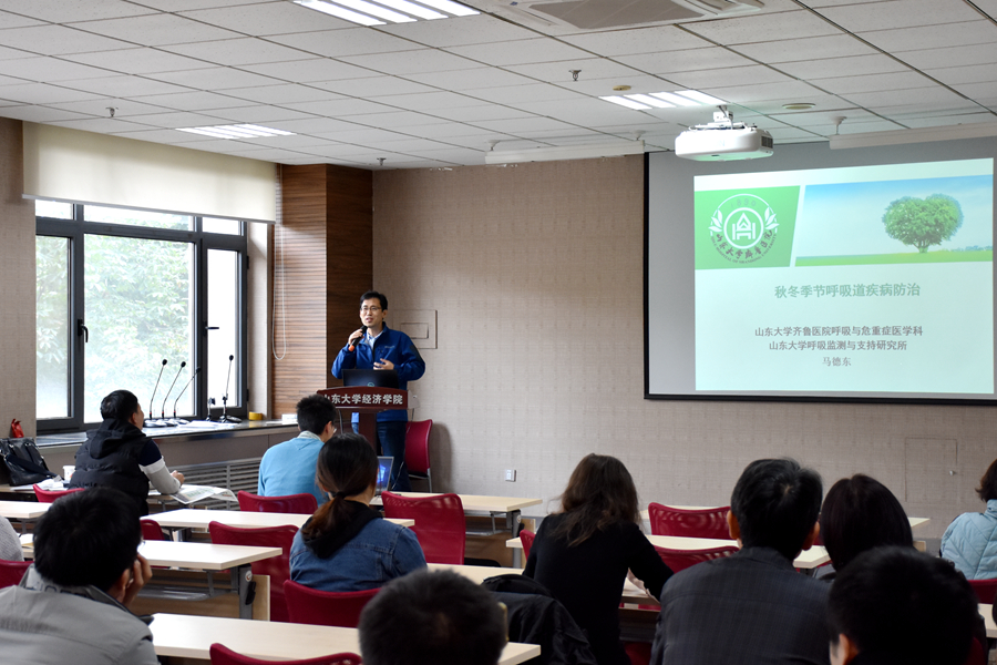 午餐会上,beats365亚洲版官网齐鲁医院呼吸与危重症医学科、beats365亚洲版官网呼吸监测与支持研究所马德东医生作了关于“秋冬季节呼吸道疾病防治”的报告。报告先简要介绍了秋冬季感冒多发原因。接着从普通感冒、流感、肺炎三种主要秋冬季节呼吸道疾病展开报告。在普通感冒方面,马德东介绍了如何区分普通感冒与流行性感冒、区分普通感冒与过敏性疾病,以及缓解感冒症状的方法。他特别指出,普通感冒大部分是由于病毒引起,不要滥用抗生素。在流行性感冒方面,马德东医生从如何判断是否得了流感、易得流感的人群、得流感的后果、如何预防流感、流感的治疗五个方面展开详细介绍,并补充说明了流感疫苗的选择及口罩的选择和佩戴相关知识。他指出,流感季节尽量不要熬夜,睡眠的剥夺对免疫力是巨大的打击。此外,马德东医生还介绍了肺炎的常见症状及其他表现。报告结束后,参会老师就报告中的有关问题与马德东医生进行了深入交流与探讨。