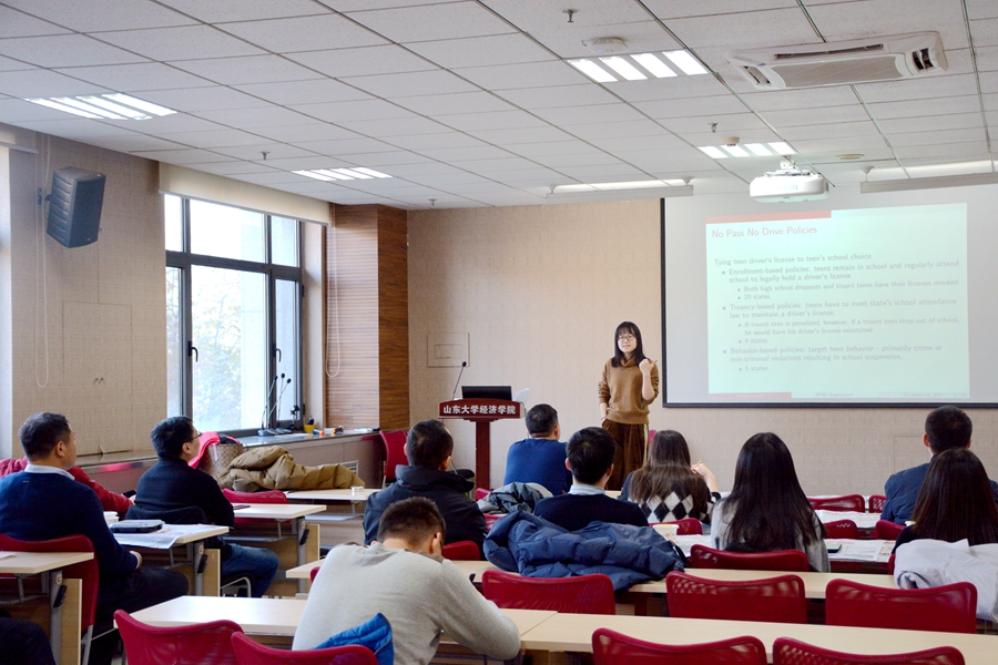 报告首先介绍了美国青少年劳动力市场的就业情况以及研究现状,随后介绍了NPND(No Pass No Drive)政策,该政策通过吊销旷课青少年员工的驾驶证以提高员工的入学率。而报告旨在研究该政策对于青少年劳动力市场的影响,特别是对于不同种族和年龄青少年影响的差别。报告选取1988年至2014年美国青少年劳动力市场的数据,采用双重差分估计这一影响并控制了政策、家庭收入、整体失业率等变量。研究结果发现,使用该数据能够验证NPND的确提高了员工的入学率的假设,而15至17岁黑人青少年兼职就业率上升是由于这些岗位是从18到25岁白人青年那里得来,即这一政策降低了美国不同种族之间的就业不平等程度。今后,报告的研究方向将从劳动力供给与需求两方面对这一原因做进一步的分析。报告结束后,参会老师就报告中的有关问题与沈丹青老师进行了深入交流与探讨。