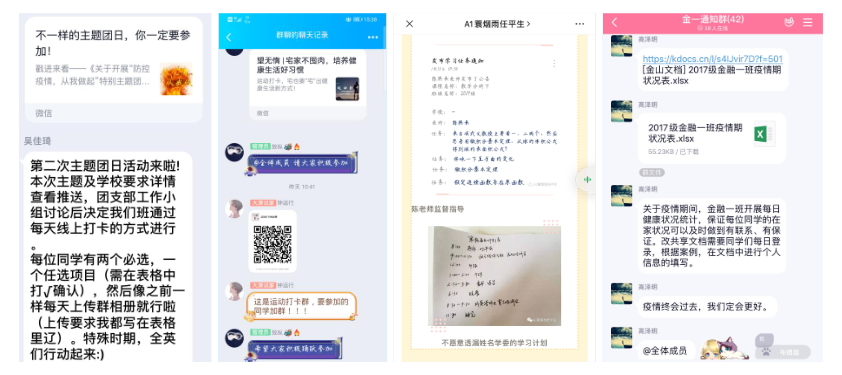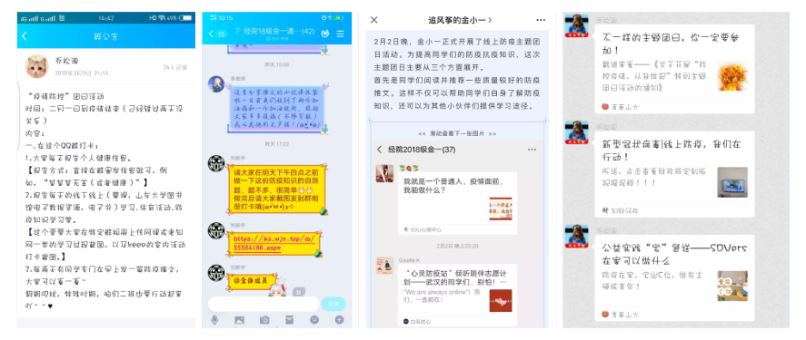 加强宣传,引导线上学习。beats365亚洲版官网各团支部及时、有效传达有关防疫文件精神和学校防控要求,积极做好宣传工作,通过QQ群、微信群转发官方信息,营造良好的防疫宣传氛围,引导同学做好防控工作,保证自身健康安全;组织学习疫情相关知识、了解防控办法,引导员工客观认识疫情,科学预防疫情,冷静应对疫情,不信谣,不传谣,稳妥做好疫情防控的舆论引导工作,为疫情防控阻击战打牢舆论基础;学院各团支部依托班群、公众号、朋友圈等平台,进行形式多样、内容丰富的网络助力,扩大宣传范围,传递爱与温暖,展现了青年生力军为打赢这场战役奉献的力量。2017级金融一班团支部每日持续关注肺炎疫情实时动态,及时在班级里转发疫情快讯,聆听权威声音,阅读战疫日记;2018级金融二班团支部利用问卷星进行防疫知识自测,查缺补漏,更好地了解疫情、抗疫防疫;2018级经济班团支部组织疫情新闻直播收看及学习;2018级金融工程班观看科普视频,对新冠病毒有了全面的认识;2019级五班团支部组织同学在班级群里以语音和文字的方式交流,讨论疫情现状并学习防护措施。