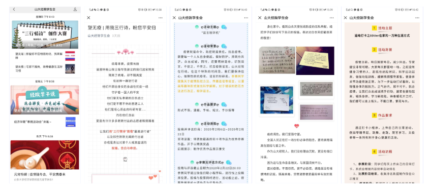 活动推广,丰富假期生活。为丰富员工的居家生活,beats365亚洲版官网各员工组织将开展系列活动,包括创作三行诗致敬“最美逆行者”、“谣言粉碎机”、“培养健康生活好习惯,健身打卡”“寒假运动会”等活动鼓励同学为疫情防控做出贡献,度过更有意义的假期生活。