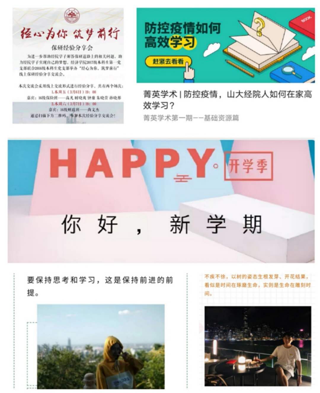 疫在攻克,学正当时。为积极响应教育部提出的“延期不延学,停课不停教”的号召,员工会、新闻中心、青年志愿者协会统一协调,坚持抗疫与暖心并举、防疫与育人结合,齐心打造员工战“疫”新阵地。三部门联合推出“青春网上团课”与“经院菁英”精品活动,发挥经院菁英模范带头作用,以优秀学子的亲身经历鼓励大家居家高效学习,切实提高自身学术水平;为帮助大家尽快适应网上教学模式,员工会各部门推出“开学季”系列推文,既吹响了学习冲锋的号角,又为同学们提供护眼、护颈椎等暖心的上课小贴士,营造了浓厚友爱的学习氛围。