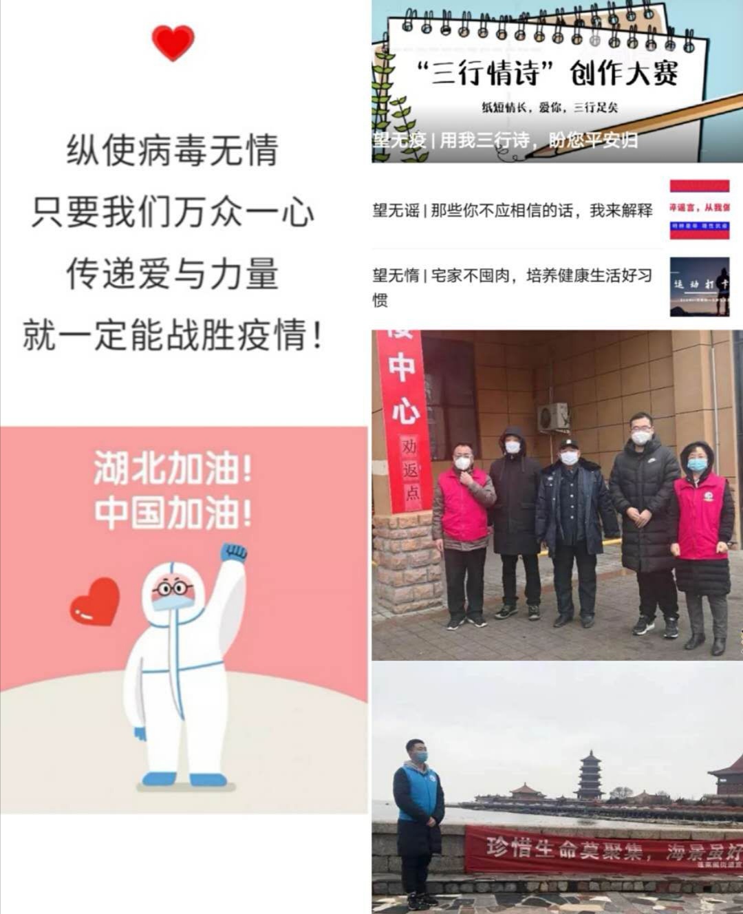 员工会组织一系列文艺防“疫”活动,以温暖的方式表达对湖北武汉的衷心祝愿与打赢疫情防控战的坚定信心。“三行情诗”致敬最美逆行者、谣言粉碎机展现青年理性、合唱团的经灵们用歌声传递微笑、“山大学子说”传达山大人的爱与温暖。各部门线上推出多篇防疫推文,为居家生活支招、解锁健康密码;线下组织山大学子们积极投身基层防疫工作,以躬行实践筑牢疫情防控墙。党员先锋们组织爱心捐款,在一线工作中锤炼党性修养;青年团员的身影出现在各地社区志愿服务中,通过走访、电话排查等方式及时获取疫情防控第一手信息、普及安全防疫知识。无论是线上活动还是线下实践,无不展现了当代青年员工的责任关怀与时代担当,这个异常寒冷的冬天因之而温情涌动。
