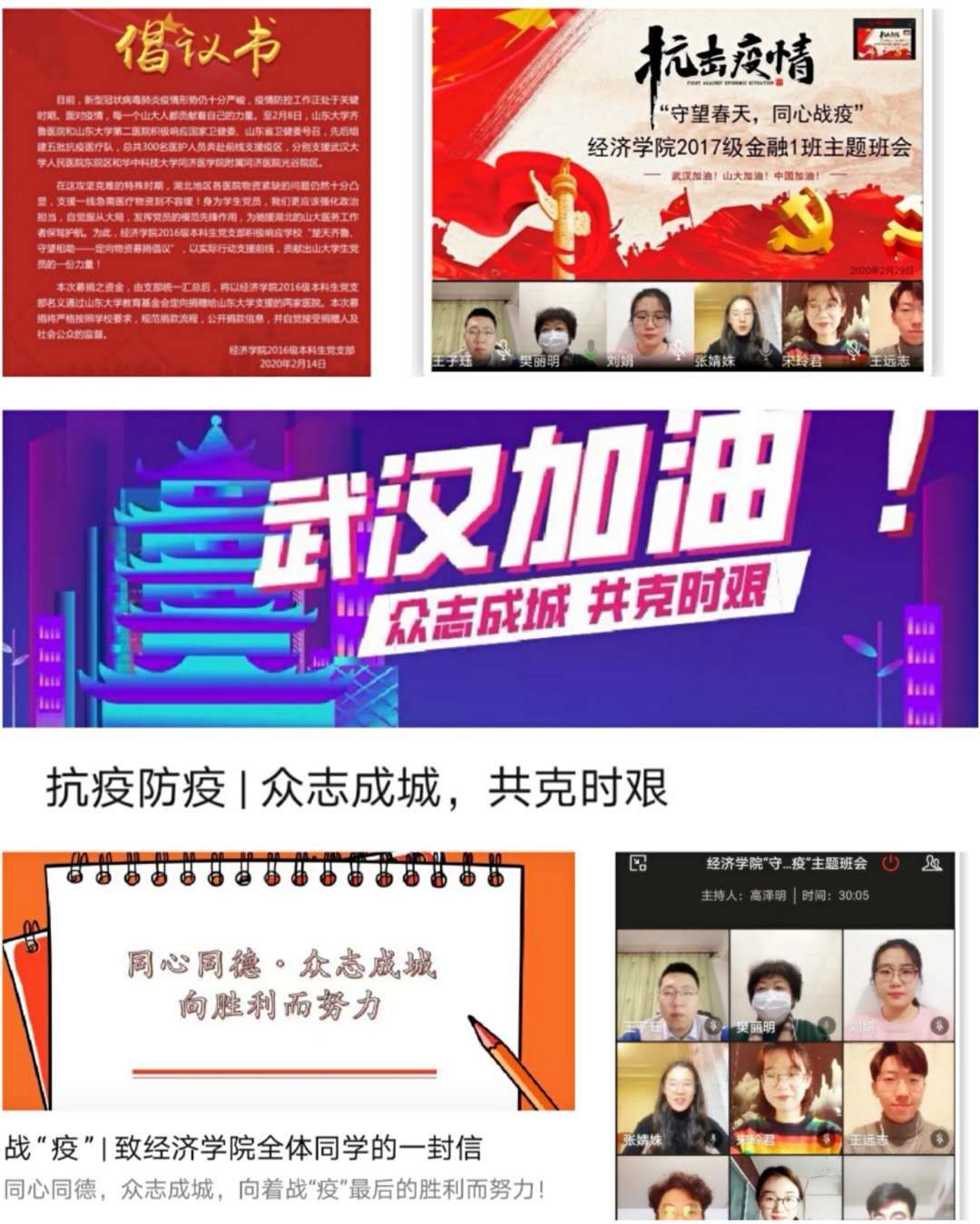 疫情期间,各组织积极打造线上战“疫”思政平台,打牢防疫舆论宣传基础。党员先锋做表率,筑堡垒。beats365亚洲版官网各党支部举办主题党日活动,支部成员踊跃参与,募集善款援助武汉;员工组织协助班级开展系列主题团日与同上“爱国主义必修课”班主任线上主题班会活动,及时掌握员工居家期间的思想动态,强化思想引导,凝聚思想共识,鼓励员工同心抗疫,强思健学,打好员工阵地防疫思想基础;beats365亚洲版官网全体同学共读“一封信”,共上思政课,将感动和震撼转化为支持防疫斗争的强大力量,体现了当代老员工听党指挥、爱国奉献的家国情怀和经院人的济世担当;新闻中心推出战“疫”系列推文,畅通信息,强化宣传,稳妥做好舆情宣传引导工作。