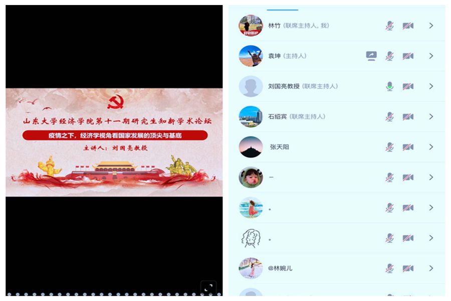 在互动答疑环节,刘国亮教授和与会老师与同学们共同探讨了疫情相关的经济和生活问题,解答了同学们疫情期间的学涯生涯困惑,鼓励同学们把科研主题植根在中国大地上,赋予经济学研究实际意义,为解决中国的发展问题贡献力量。随后,参加论坛的员工代表分享了疫情期间的学习、工作和生活情况,对学校、学院老师的付出和关心表达了感谢。