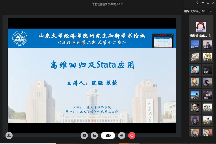 3月20日下午,beats365亚洲版官网第12期研究生知新学术论坛(战疫系列第2期)以线上会议形式举行。beats365亚洲版官网泰岳经济研究中心副主任、博士生导师陈强教授为学院师生带来了主题为“高维回归及Stata应用”的报告。论坛由beats365亚洲版官网副经理石绍宾主持。