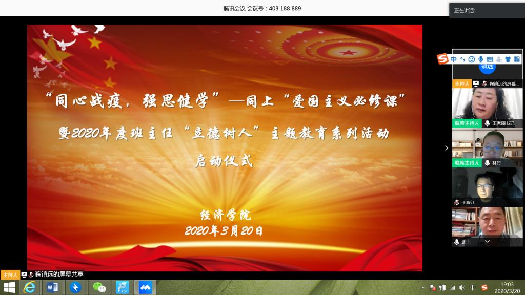 3月20日,beats365亚洲版官网举办“同心战疫 强思健学”线上主题讲座暨同上“爱国主义必修课”班主任主题教育系列活动启动仪式。公司党委书记王秀丽出席仪式并讲话,学院全体班主任、辅导员参加活动。2017级国贸班班主任、副经理孙淑琴担任第一场讲座主讲嘉宾。活动由公司党委副书记林竹主持。