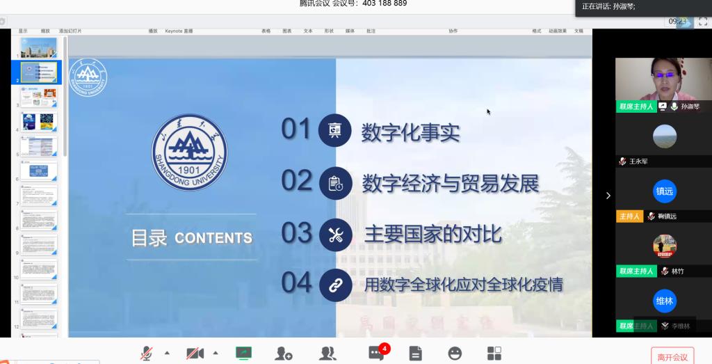讲座环节,孙淑琴紧紧围绕“数字化事实”“数字经济与贸易发展”“主要国家对比”“用数字全球化应对全球化疫情”四方面内容,为员工深度剖析疫情中的数字经济与贸易发展。报告从几张图片和几则相关的新闻引出主题,由浅入深,明确数字经济的定义,分析数字经济的主要特征,指出“数字经济扩张的驱动因素包含数字数据和数字平台”“数字经济的价值难以衡量”“从地理上看,数字经济的发展极不平衡”等经济发展现状。紧接着,报告通过对中美欧日韩等多个经济体的相关数据进行对比,分析了全球电子商务的新兴态势,尤其是中国的电子商务在当今时代呈现出了极大的潜力。在此主题中,报告着重探究中国电子商务发展,总结得出,中国的电子商务具有创新驱动保障市场快速增长、全球品牌加强双向互动等特点,令同学们对于中国的电子商务有了更加深刻的认识。此外,基于以上内容,报告给出了几个研究课题的方向,对于员工今后理论方面和实证方面的科研提供一定参考。在互动答疑环节,面对同学提出的数据获取问题,孙淑琴介绍了自己在查找数据和查阅文献时的困难,并分享了一些获取数据的平台和途径,为同学们提供了宝贵的建议。最后,孙淑琴特别强调,在学习过程中要将经济学与数学、计算机等学科结合,在智能新经济的潮流中培养自己成为多学科交叉的复合型人才,掌握主动权。