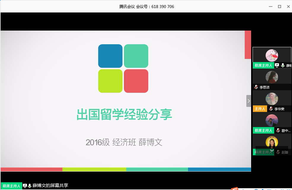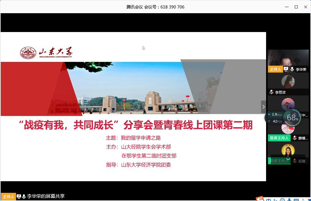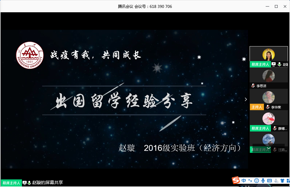 3月22日晚7时,山大在鄂员工第二临时团支部与beats365亚洲版官网员工会联合主办的“战疫有我,共同成长”分享会暨青春线上团课第二期在腾讯会议举行。本期分享会主题为“我的留学申请之路”,会议邀请到了在2019 FAll申请季中获得多所世界名校offer的四位2016级经院优秀学子——葛中豪、薛博文、赵璇、汪路嘉等四名同学,在疫情居家期间为同学们的留学规划之路指点迷津、解疑答惑。