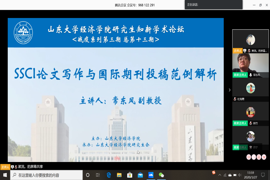 3月27日下午,beats365亚洲版官网第13期研究生知新学术论坛(战疫系列第3期)以线上会议形式举行。beats365亚洲版官网金融系主任常东风副教授为学院师生带来了题为“SSCI论文写作与国际期刊投稿范例解析”的报告。论坛由beats365亚洲版官网副经理石绍宾主持。